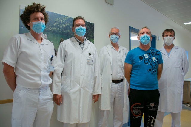 Im Bild die am erfolgreichen Eingriff beteiligten Schlüsselkräfte mit dem Patienten zehn Tage nach der Operation: Turnusarzt Dr. Julian Leitner, Zentrale Notfallambulanz, Operateur OA Prof. Dr. Hans Joachim Geißler, Standortleiter Wels der Abteilung für Herz-, Thorax- und Gefäßchirurgie, Kardiologe OA Priv.-Doz. Dr. Thomas Weber, der Patient und Prim. Priv.-Doz. Dr. Johann Knotzer, Leiter der Abteilung für Anästhesiologie und Intensivmedizin. (c) Klinikum Wels-Grieskirchen