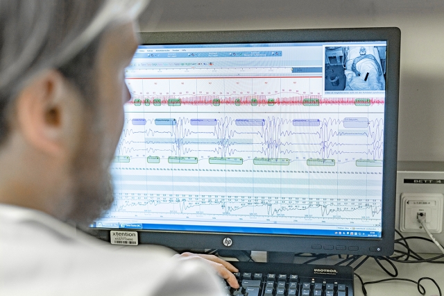 Im Schlaflabor an der Lungenabteilung am Klinikum Wels-Grieskirchen wird der nächtliche Schlaf der Patienten umfassend analysiert. Die Polysomnographie erfasst verschiedene Körperfunktionen, welche im Anschluss ausgewertet werden. Gemessen werden unter anderem Hirn- und Muskelaktivität, Augenbewegungen, Herzrhythmus, Beinbewegungen, Körperlage, Atemgeräusche und Sauerstoffsättigung des Blutes. (c) Klinikum Wels-Grieskirchen/Nik Fleischmann