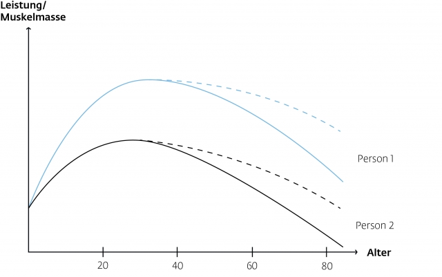 Mit den Jahren baut der Mensch Leistung auf, hält dieses Leistungsniveau über eine bestimmte Phase, bevor es wieder abnimmt. Person 1 ist körperlich aktiv und bewegt sich mehr als Person 2. Durch regelmäßiges Training können beide ihre Kondition besser halten als ohne Training, Person 2 kann aber das Level von Person 1 nicht erreichen, da sie die Voraussetzungen dafür in den Vorjahren nicht aufgebaut hat. Foto: Klinikum Wels-Grieskirchen