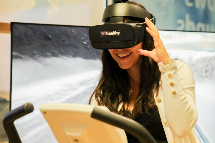 VRhealthy heißt das Produkt, das körperliche Aktivität mit dem Erkunden und Steuern von virtuellen Welten verknüpft. Die Lösung besteht aus einem Trainingsgerät, in diesem Fall einem therapieüblichen Ergometer, das mit einer VR-Brille und virtuellen Fahrstrecken gekoppelt ist. Das 360-Grad-Erlebnis ermöglicht PatientInnen ein emotionales und körperliches Erleben in einer in Echtzeit generierten virtuellen Umgebung.