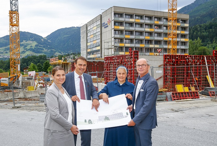 Ludwig Gold, Geschäftsführer im Klinikum Schwarzach: “Die Errichtung des neuen Campus-Gebäudes ist ein wichtiges Infrastrukturprojekt, mit dem wir die wohnortnahe Ausbildung von Pflegekräften in allen Qualifikationsstufen nachhaltig für das Innergebirg absichern. Aus heutiger Sicht wird sich der enge Zeitplan mit Fertigstellung und Inbetriebnahme im Oktober 2020 einhalten lassen.” Davon überzeugte sich bei einem Lokalaugenschein auch Gesundheits- und Spitalsreferent LH-Stv. Christian Stöckl. “Die Kardinal Schwarzenberg Akademie in Schwarzach ist eine unverzichtbare Ausbildungseinrichtung für viele Menschen aus den südlichen Bezirken unseres Landes. Die regionale Ausbildung sichert die pflegerische Versorgung in unseren Spitälern sowie in den extramuralen Einrichtungen wie Senioren- und Pflegeheimen ebenso wie für die mobilen Dienste ab“, betonte Stöckl, der auch auf das geschnürte Maßnahmenpaket im Rahmen der Plattform Pflege und Betreuung verwies: „Dabei werden bis zum Jahr 2023 rund 74 Millionen Euro in Pflege und Betreuung investiert. Ein Fokus dabei liegt auf dem Bereich der Ausbildung“, so Stöckl.