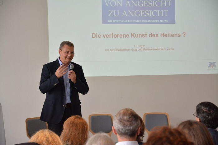 Nachdem die Thesen der Vorträge am Nachmittag mit den Referent/innen und dem engagierten Publikum in Kleingruppen reflektiert wurden, fand die Tagung mit einem Impulsreferat von Gerald Geyer ihren Abschluss. Der Ärztliche Direktor des Grazer Krankenhauses der Elisabethinen sprach dabei über Möglichkeiten, „Die Verlorene Kunst des Heilens?“ in Verbindung mit einer wertorientierten Führung und einer nachhaltigen Unternehmenskultur vertieft zu etablieren.