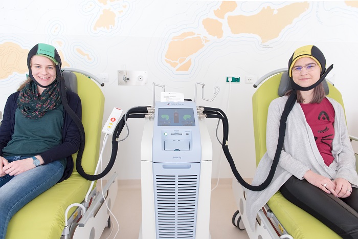 Zwei junge Besucherinnen probieren im St. Josef Krankenhaus Wien aus, wie sich eine Kühlhaube anfühlt. Damit kann der Haarausfall bei einer Chemo reduziert werden. Foto: © Peter Roesler