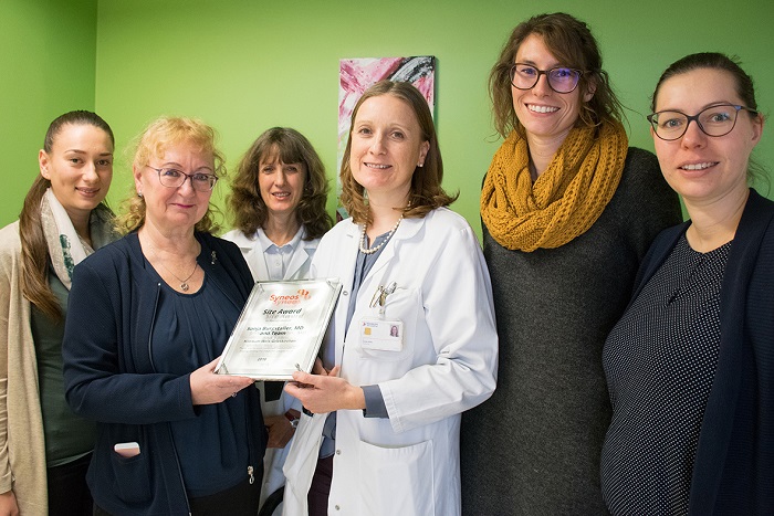 Als „das beste Zentrum der Welt“ bezeichnete Nadja Grübel von Syneos Health, Partner in der Studienauftragsforschung, ihre Ansprechpartner im Klinikum Wels‐Grieskirchen. Sie überreichte den Preis an Studienleiterin OÄ Dr. Sonja Heibl, die beteiligten Prüfärzten (stellvertretend am Foto Dr. Vera Trommet, MSc) und die Studienkoordinatorinnen Katharina Schmied, Isabella Rauscher und Teresa Bogensperger. Foto: © Klinikum Wels-Grieskirchen
