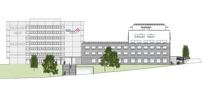 Um den räumlichen Bedarf für die neuen Studentinnen und Studenten abzudecken, wird nun ein multifunktionaler Neubau am “Campus Schwarzach” errichtet: Neben dem Studentenwohnheim mit 121 Betten, mehreren Hörsälen sowie 22 geförderten Mietwohnungen für Mitarbeiter des Kardinal Schwarzenberg Klinikums werden im Erdgeschoß auch der neue Schwarzacher Rotkreuz- sowie der neue Notarzt-Stützpunkt mit sieben Garagen und zehn Nächtigungszimmern für Notarzt, Fahrer, Zivildiener sowie Freiwillige untergebracht.
