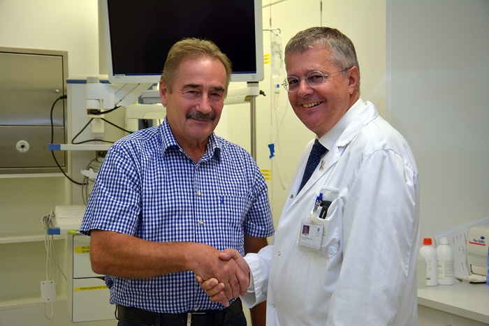Karl Spindelberger aus Gallneukirchen war 2008 der erste da Vinci Patient und freut 10 Jahre danach sich gemeinsam mit Prim. Dr. Wolfgang Loidl über die wiedererlangte Lebensqualität. Quelle: Ordensklinikum Linz