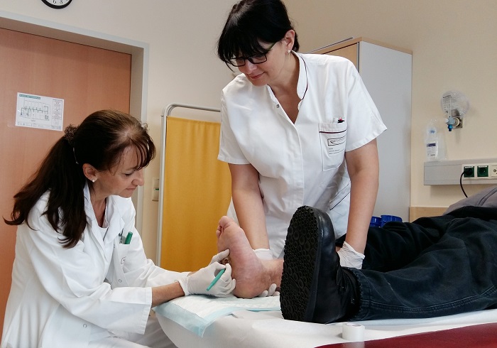 Heute wird die Wunde eines Mannes fachmännisch versorgt. Eine große Wunde an der Fußsohle plagt ihn seit langer Zeit. Regelmäßige Verbandswechsel werden laut Anordnung im häuslichen Bereich weiter durchgeführt. Zur Kontrolle in die Wundambulanz soll er in zwei Wochen wieder kommen, erklärt ihm die Spitalsärztin. „Wir kümmern uns nicht nur um die Diagnostik und die Versorgung der Wunde, sondern auch um die medikamentöse Therapie, die Hautpflege und um die Anpassung der richtigen Schuhausstattung.“