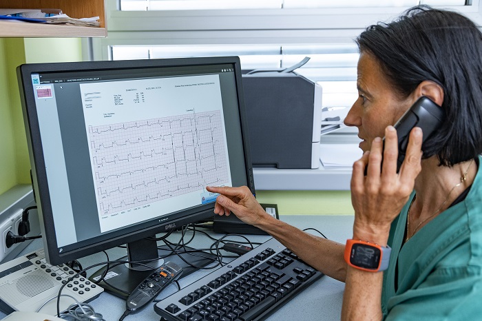 Die elektronische EKG‐Übertragung vom Notfalleinsatzfahrzeug direkt an die Kardiologie ermöglicht eine gesicherte Diagnose und einen unverzüglichen Eingriff. Dr. Florian Wimmer übermittelt das EKG elektronisch an die Kardiologie des Klinikum Wels‐Grieskirchen, wo Dr. Elisabeth Laßnig die Diagnose bestätigt und sofort die Intervention vorbereitet. © Klinikum Wels‐Grieskirchen
