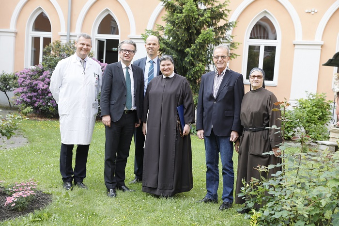 Im Bild von links nach rechts: Gerald Geyer (Ärztlicher Direktor KH der Elisabethinen), Christopher Drexler (Gesundheitslandesrat), Christian Lagger (Geschäftsführer KH der Elisabethinen), Sr. Bonaventura Holzmann (Generaloberin und Geschäftsführerin der Elisabethinen), Dr. Josef Neuhold (Vorstand der Abteilung für Anästhesie im KH der Elisabethinen), Sr. Consolata Maderbacher (Generalrätin der Elisabethinen). Bildnachweis: Elisabethinen/Neuhold
