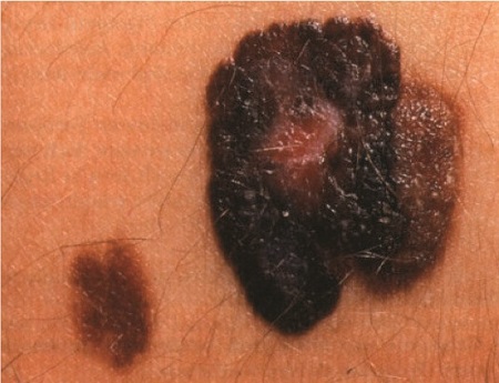 Schwarzer Hautkrebs: Asymmetrie und Mehrfarbigkeit weisen auf ein Melanom hin. © Klinikum Wels‐Grieskirchen