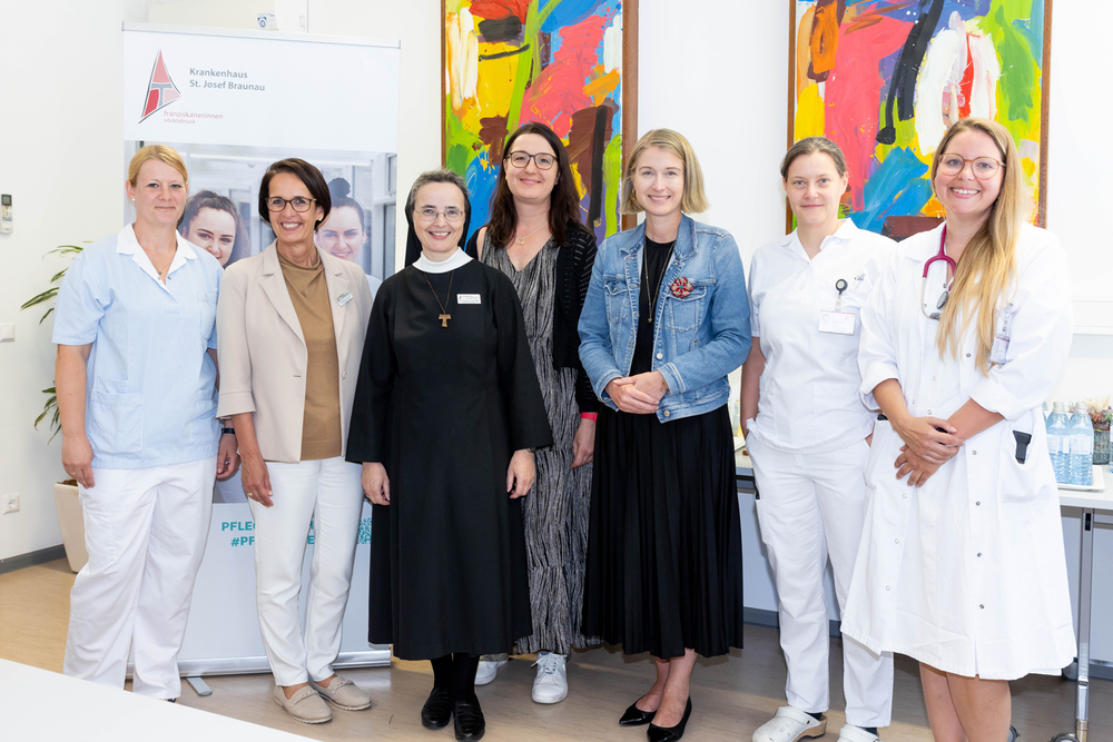 Erfolgreiches Teamwork: Eva Arnold, Gerlinde Bermannschlager (Pflegedirektorin Krankenhaus Braunau), Krankenhausoberin Sr. Katharina Franz, Karin Gubisch Fuhrmann (Leiterin Volksschule Braunau-Laab), LH-Stellvertreterin Christine Haberlander, OÄ Corinna Hirzinger (Ärztliche Direktorin Krankenhaus Braunau) und OÄ Katharina Danner freuen sich über das gelungene Projekt. © Krankenhaus Braunau