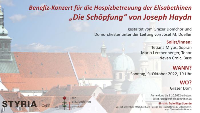 Als Benefiz-Konzert für die Hospizbetreuung der Elisabethinen gestalten daher der Grazer Domchor und das Grazer Domorchester unter der Leitung von Josef M. Doeller Haydns „Schöpfung“ am Sonntag, 9. Oktober um 19Uhr im Grazer Dom. Solist/innen sind Tetiana Miyus (Sopran), Mario Lerchenberger (Tenor) und Neven Crnic (Bass). Für den Eintritt in das Konzert bitten die Elisabethinen um eine freiwillige Spende.